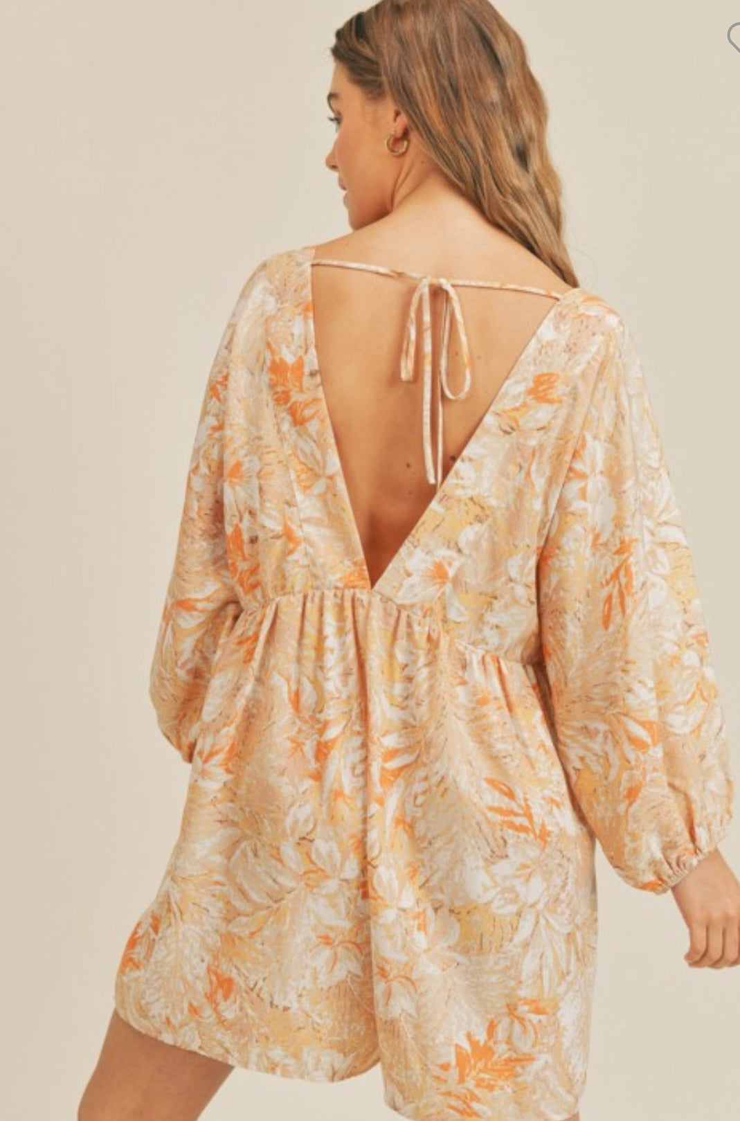 Floral print Oversized Romper, V neckline, Tie back detail and side pockets.