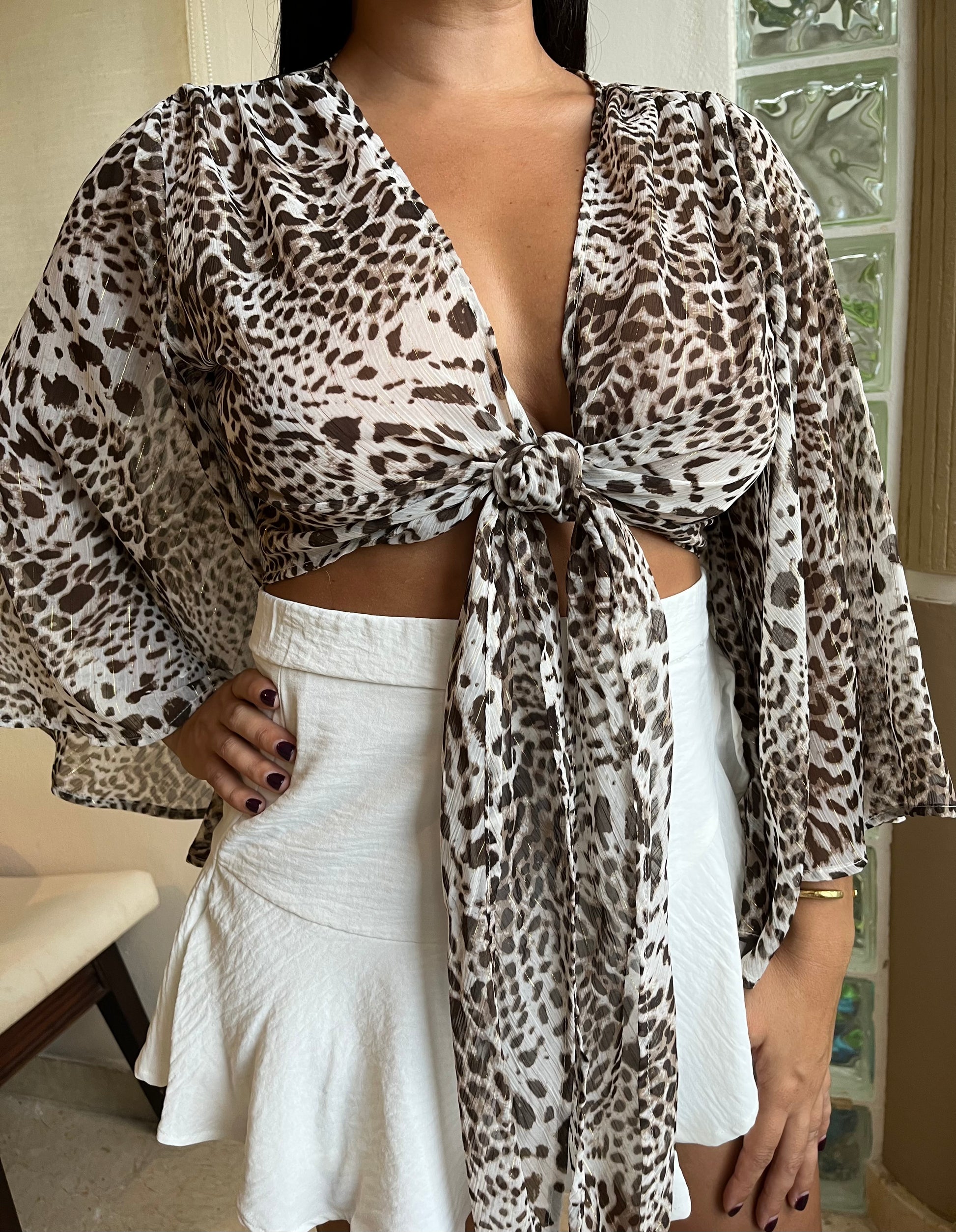 Print Cardigan Wrap Top. Model wearing size Small. Style it in 3 ways.