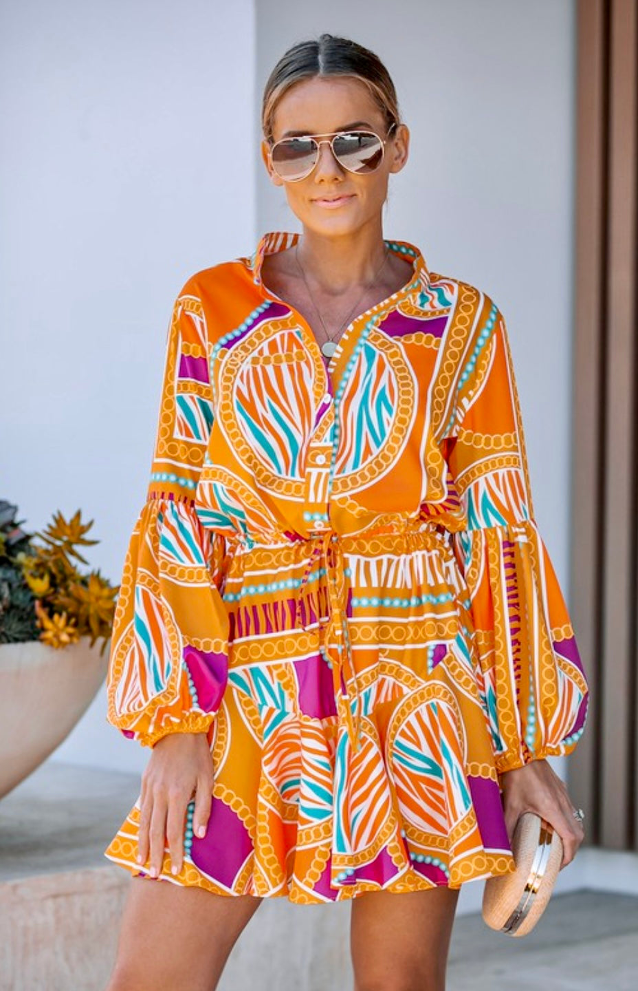 Orange print dress, adjustable waist strap with balloon sleeves and elastic cuffs, buttoned front closures.